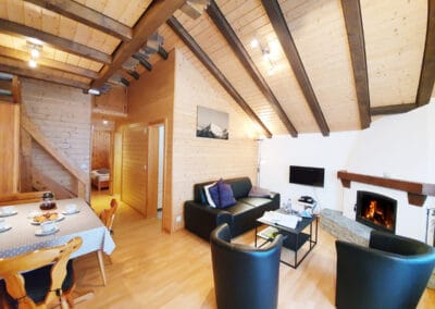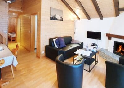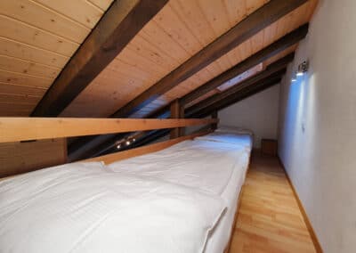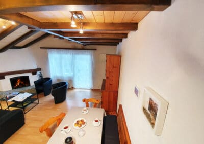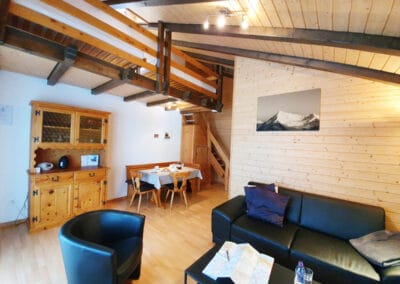 Located under the roof of the Bergdohle holiday home, the 2-room apartment is the ideal holiday apartment for families with kids. The 38-square-meter apartment can accomodate up to four people, with two beds in the loft sleep area above the living room. There is also a balcony with a table, chairs and sun umbrella. From the balcony, a spectacular view of the village of Randa and the surrounding mountain and forest scenery awaits you.