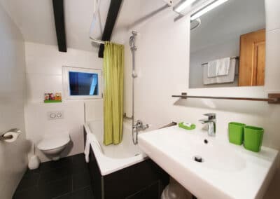 The apartment has a double room as well as two beds in the loft sleep area above the living room. The beds in the living room measure 190 cm x 90 cm and can also accommodate adults. The bathroom has a tub, toilet and hair dryer.