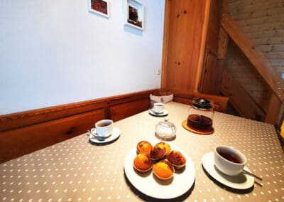 The kitchen is also well equipped. In addition to a stove with three burners, refrigerator with freezer, electric kettle, toaster, fondue set and coffee maker, you will find everything you need for cooking. Afterwards, the dishwasher takes care of the dirty dishes!